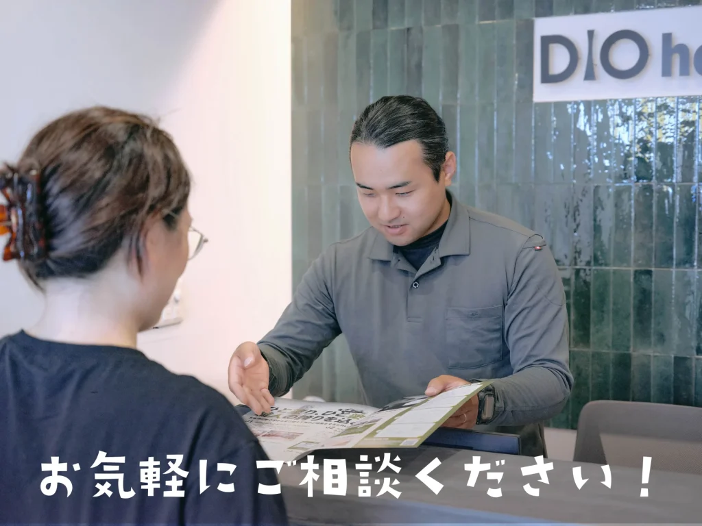 DIOhomesでは、現地状況を見て「今やるべきこと」と「まだ急がなくていいこと」を分けて説明することを大切にしています。掃除で済むのか、塗り替えのタイミングなのかが曖昧な段階でも、判断材料を増やすところから一緒に整理できます。