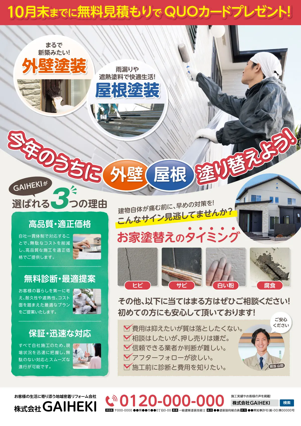 外壁塗装のチラシで注目するポイント 外壁塗装業者のチラシを見るメリット 外壁塗装を検討中の方にとって、 新聞折込やポスティングで届くチラシは非常に便利な情報源です📚 チラシには施工会社の実績、使用する塗料の詳細、 キャンペーン情報などが網羅されています。 これらの情報を活用することで